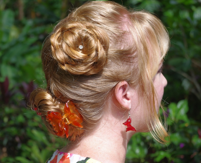 Here are a few pictures of my look for today~ I was aiming for the criss-cross updo that Lilith Moon shows in one of her videos, but got this beehive updo with a flower accent instead...my low bun is actually a fishtail braid that I wound up and around until it ended up looking like this: